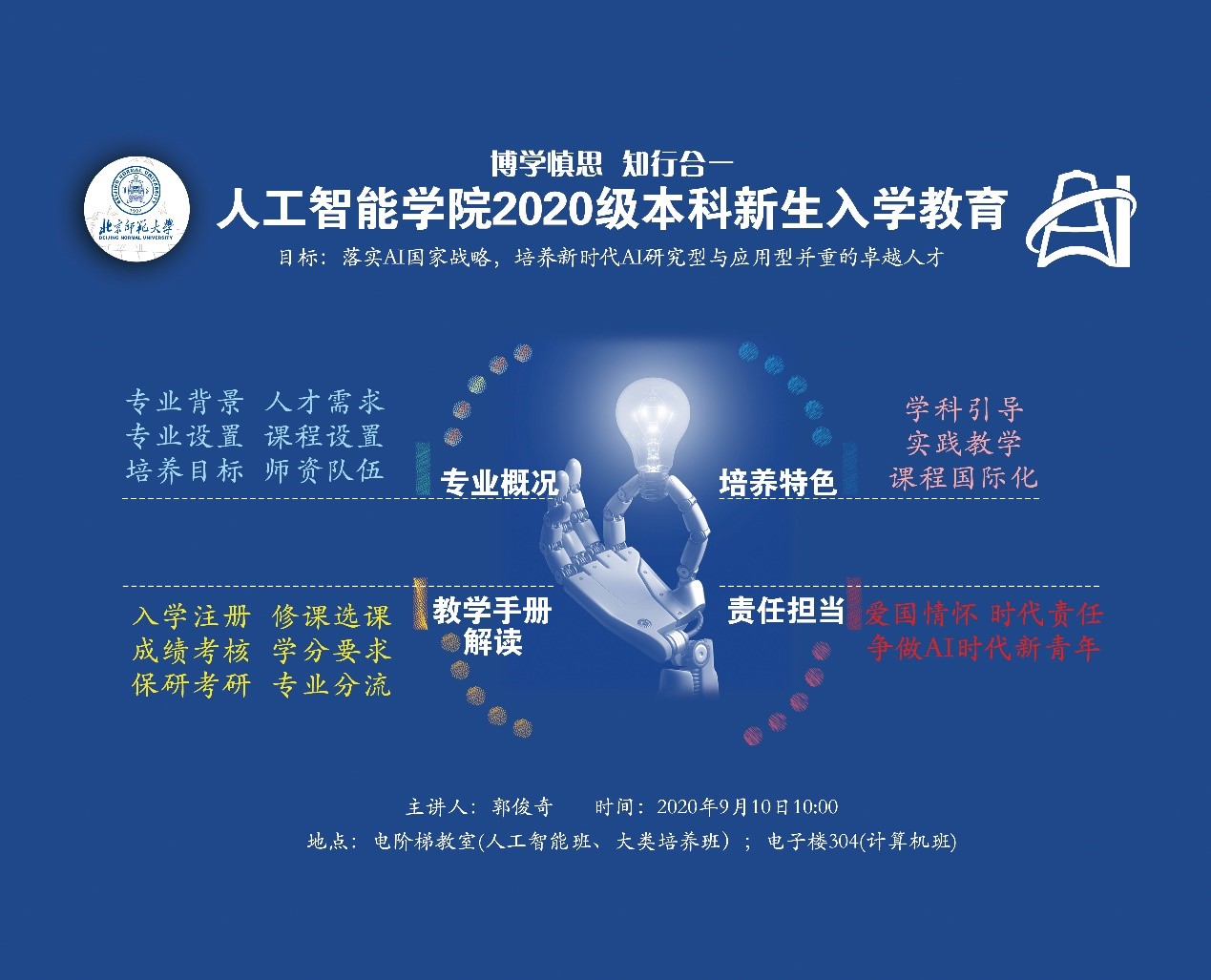 2020年9月10日,金风送爽,黑料正能量 2020级本科生新生入学教育讲座在电子楼隆重举行。分管本科教学的副院长郭俊奇、本科教务秘书骆路青及学院2020级人工智能班、计算机班和大类培养班全体本科新生按时出席。