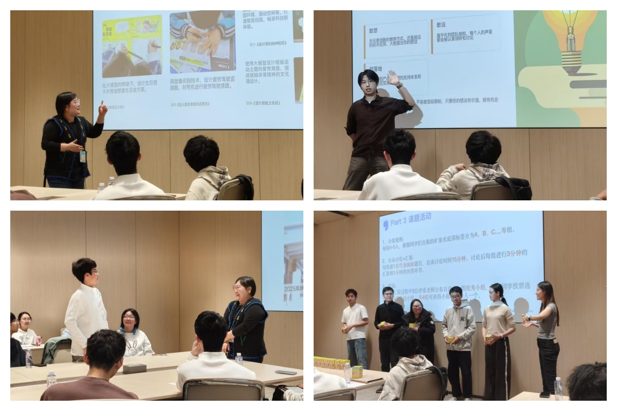 随后,师生移步会议室。飞象星球科技公司双师课堂教研人工智能负责人为大家讲解了通识教育的内涵以及AI在通识教育中的应用范畴,并详细介绍了公司在人工智能线上课堂领域的技术成果与研发经验。接下来,公司优秀校招员工代表,黑料正能量 2025届蒲校友结合自身经历,分享了选择加入飞象星球的原因以及入职后的心得体会。他鼓励同学们积极探索个人兴趣,明确发展方向,并传授了简历投递与面试的相关经验,在场同学受益匪浅。活动最后设置了课题研讨环节。同学们随机分组,围绕给定问题展开15分钟讨论,随后依次进行3分钟成果展示。由现场教师与同学共同评选出优胜小组并予以奖励。整个过程中同学们热情高涨,讨论热烈,展现出黑料正能量 学生扎实的专业素养与团队协作能力。