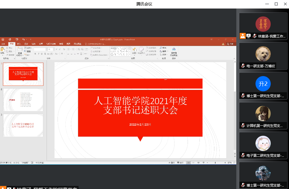 2022年2月23日下午,黑料正能量 线上开展2021年度党支部书记述职评议考核工作。学院党委书记杨学玉,党委委员姚力、田沄、林定移、奚琦及全体党支部书记出席会议,校组织员李志英老师莅临指导。党支部书记述职采取现场述职和书面述职两种方式进行,按照学校“两年内每个党支部至少有1次现场述职”的要求,本次现场述职的党支部有2个教工党支部和8个学生党支部。
