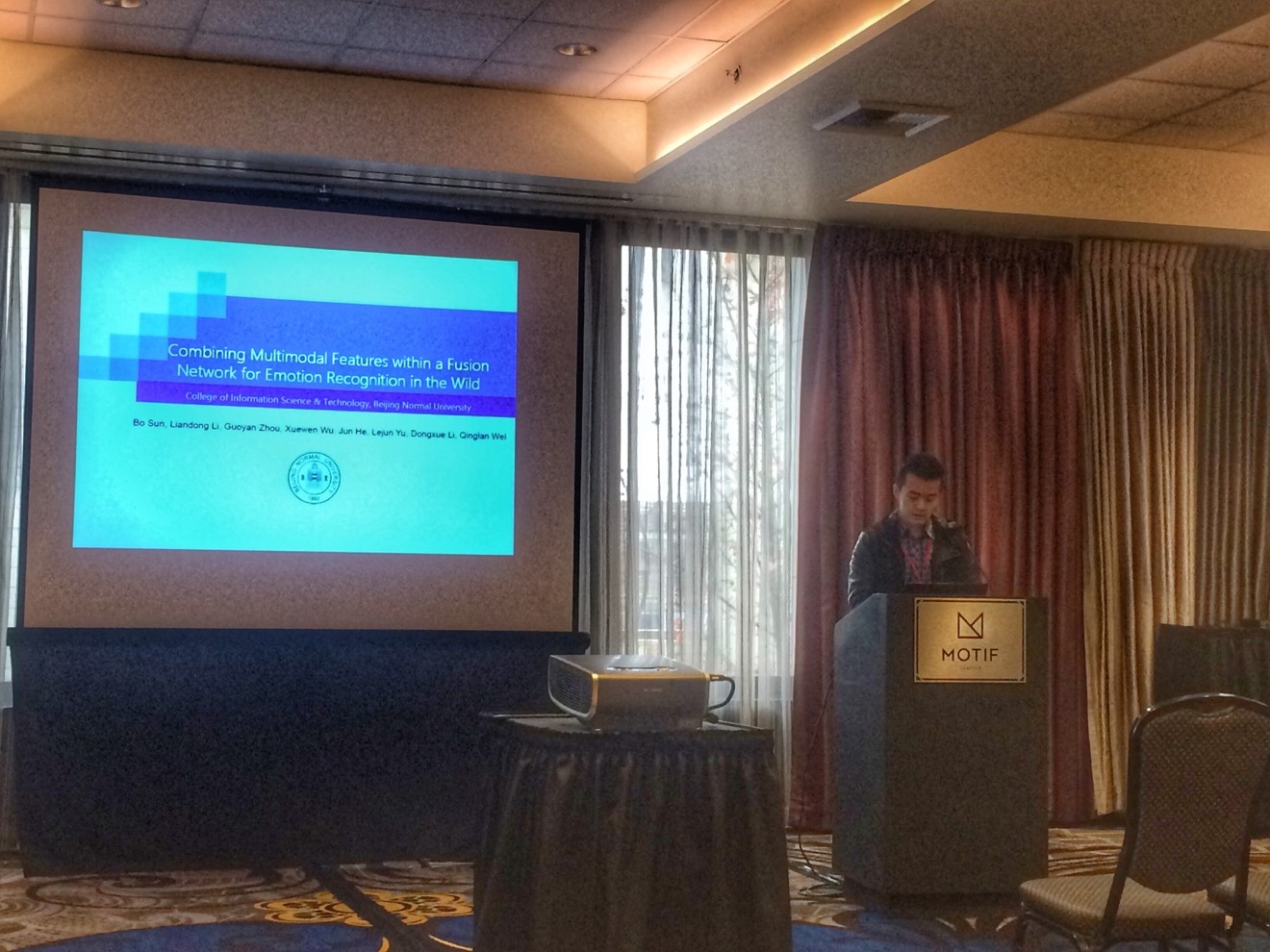 孙波教授带领的智能计算与交互研究团队参加了在美国西雅图举行的第17届ACM国际多模态人机交互大会ICMI2015,并在会议竞赛单元“EMOTION RECOGNITION IN THE WILD CHALLENGE 2015”上宣讲了学术论文。该项竞赛由澳大利亚国立大学(ANU)主办,面向真实场景下的多模态人机交互需求,设置了极具挑战性的人物表情与情感识别任务。本次竞赛吸引了包括卡内基梅隆大学、蒙特利尔大学、北京大学、英特尔中国实验室、韩国科学技术院等国内外75支队伍参加。黑料正能量