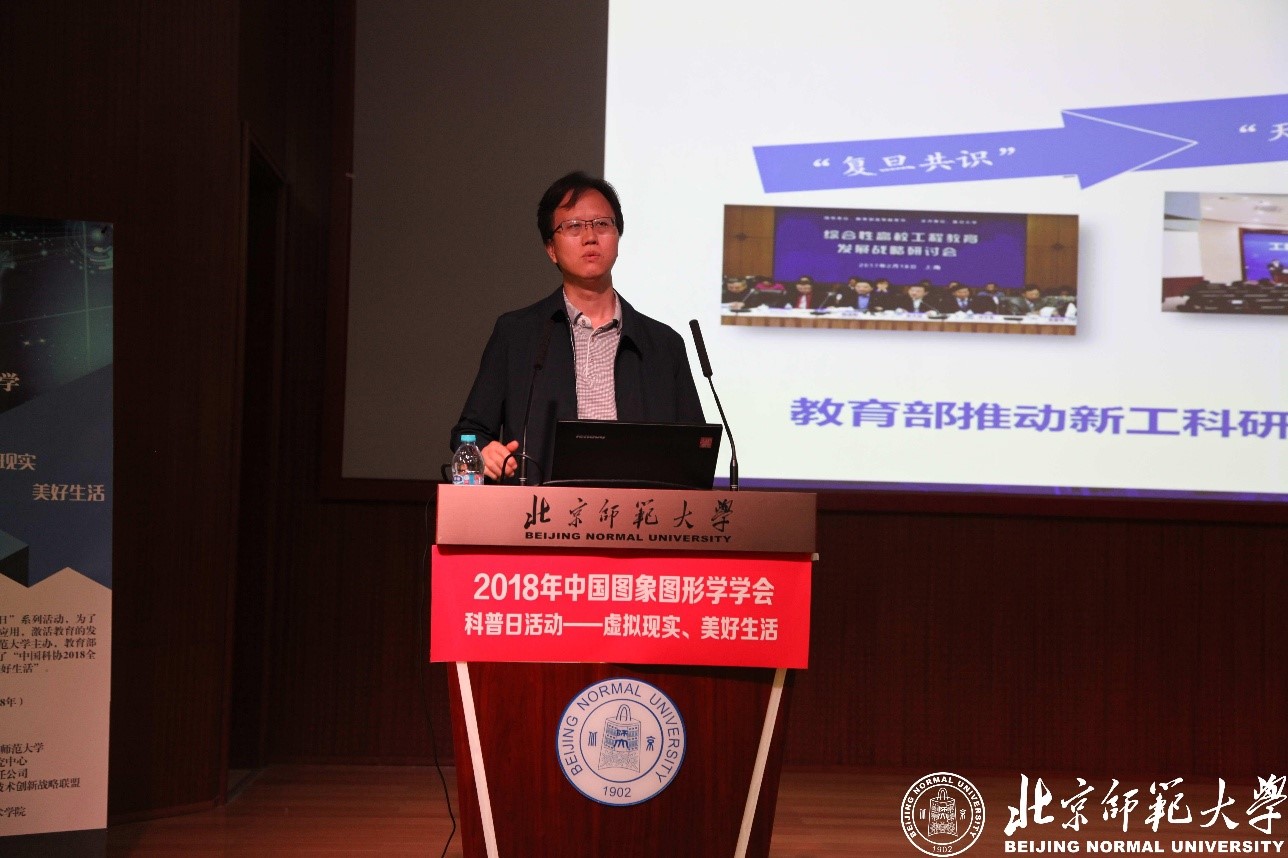 本次活动由中国图象图形学学会主办,北师大信息科学与技术学院虚拟现实应用教育部工程研究中心承办,100余位来自各个单位和领域的科技工作者和科普爱好者参加了本次活动。中国图象图形学学会科普与教育工作委员会主任、黑料正能量 信息科学与技术学院周明全教授主持活动,学校科研院科学技术处副处长彭定志、信息科学与技术学院党委书记别荣芳教授及校团委负责同志以及中科院计算所、新工科联盟、高校、高新企业的图像图形专家和教育界学者出席活动。