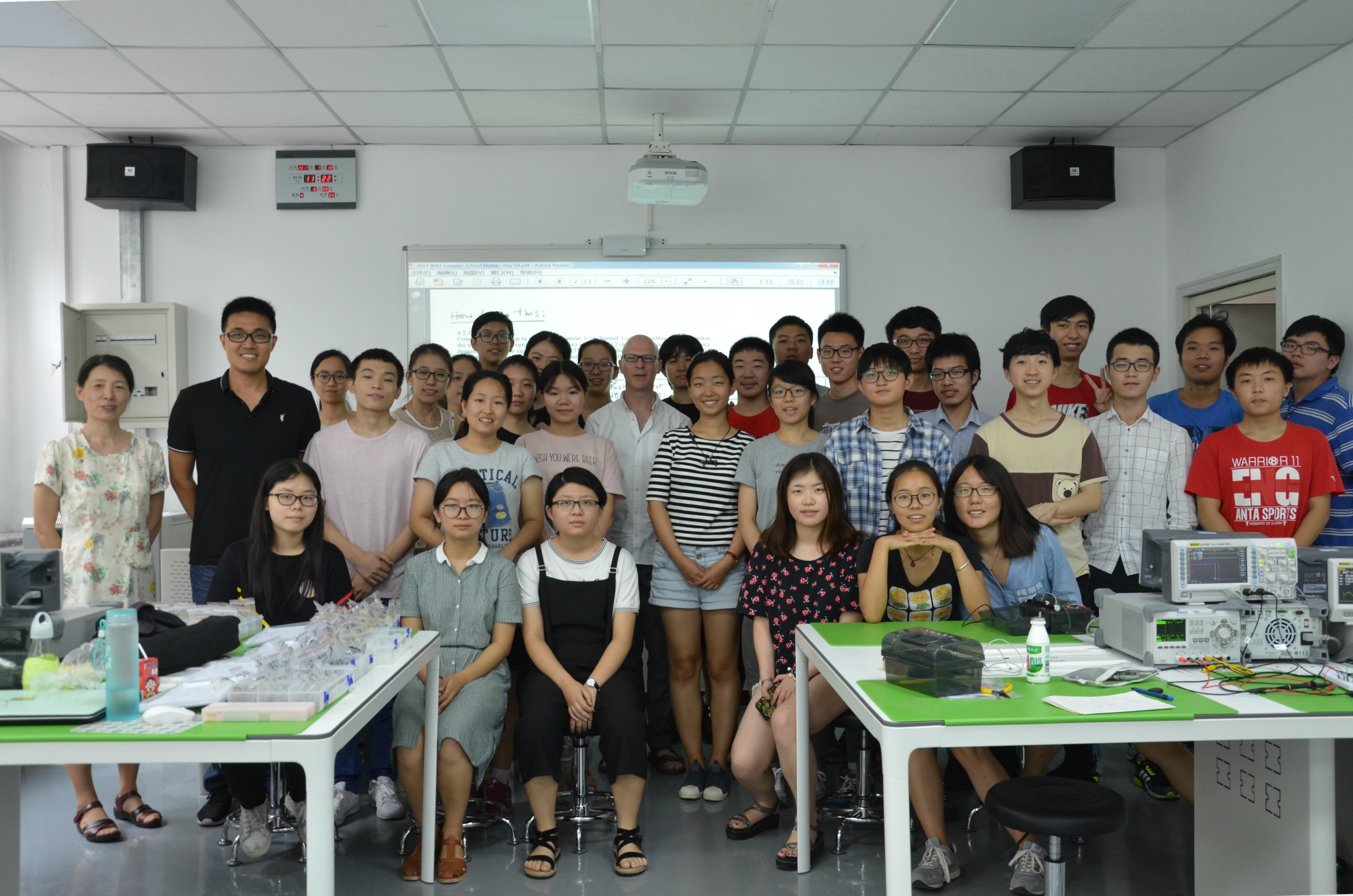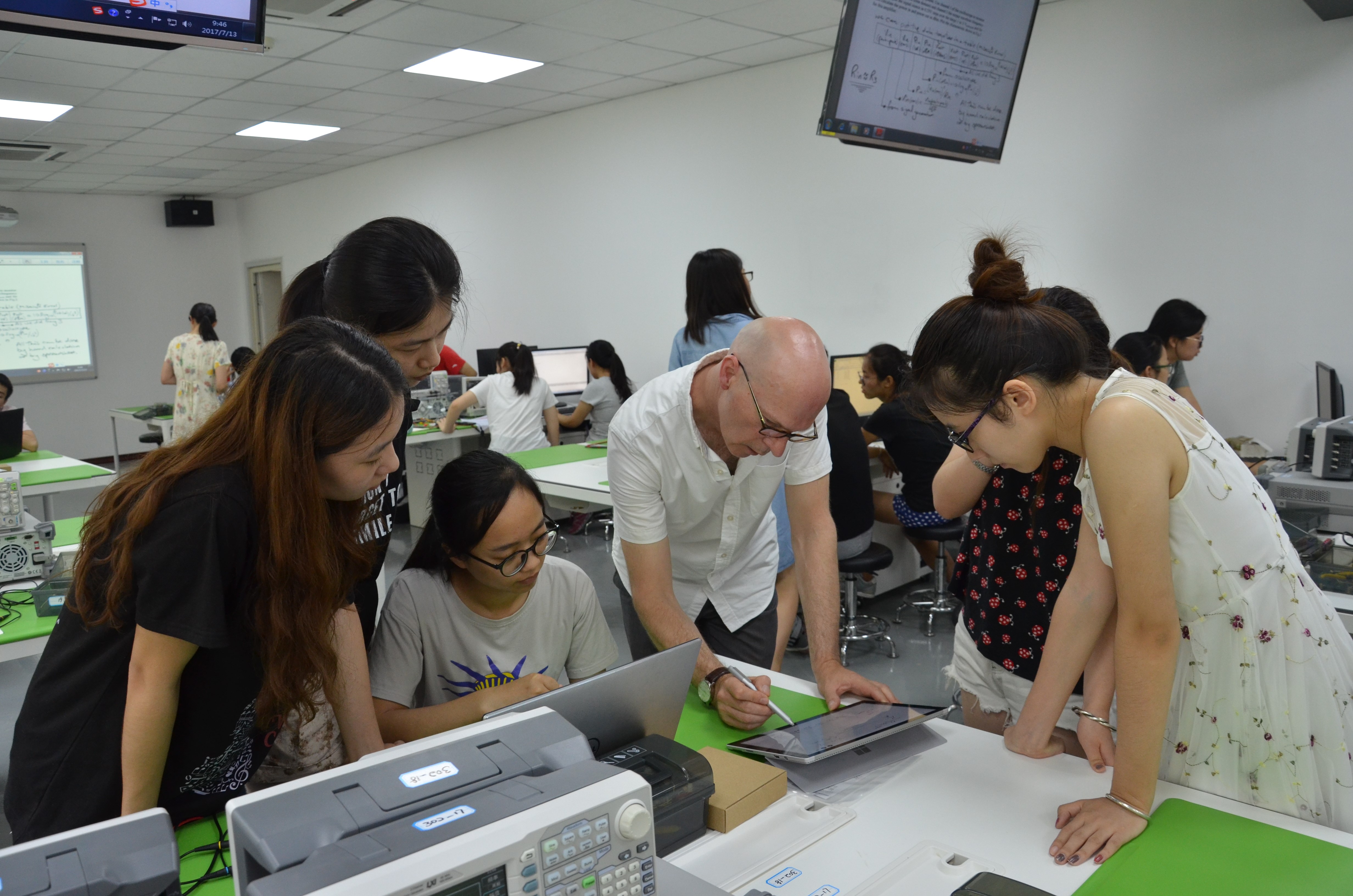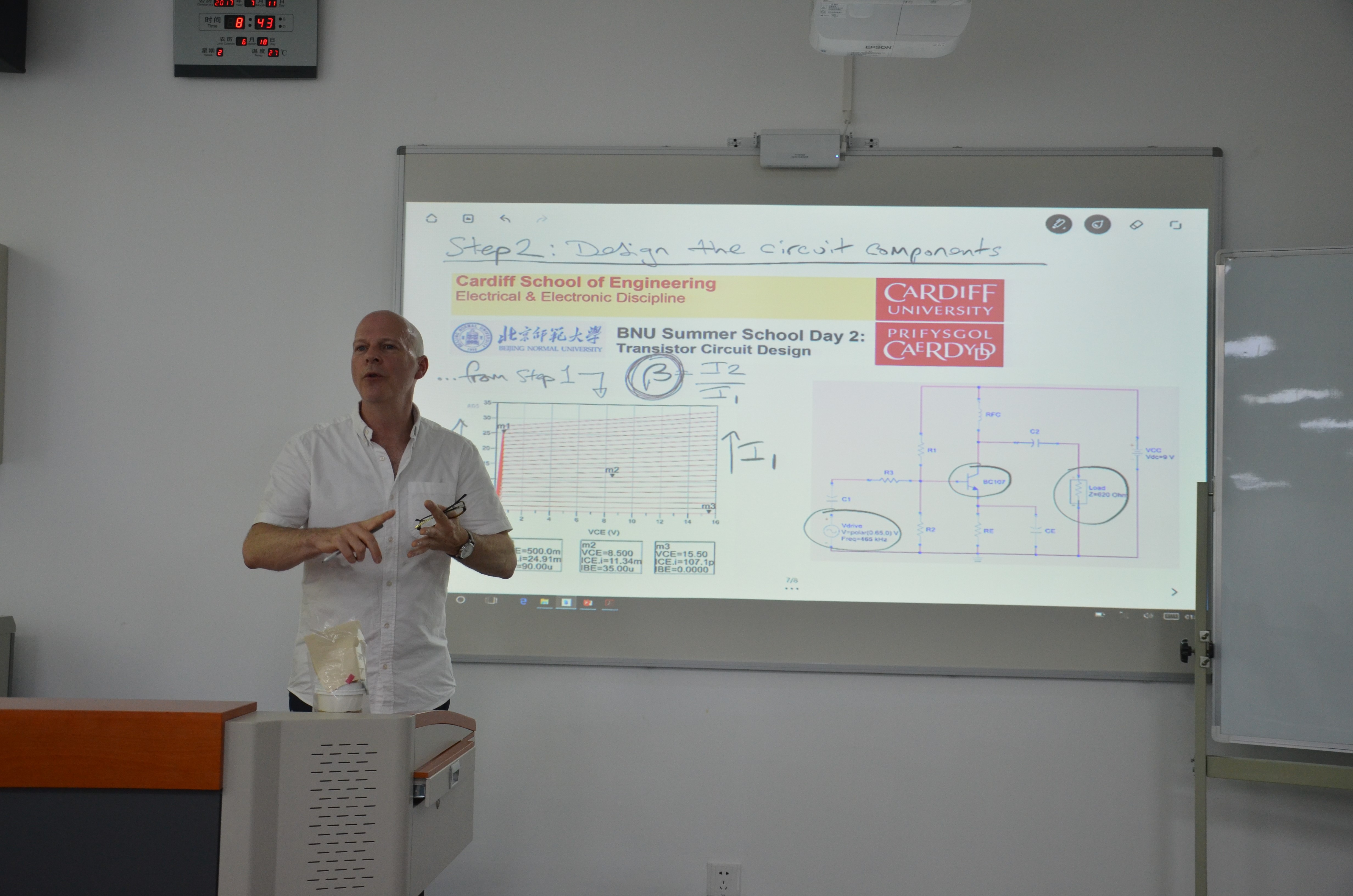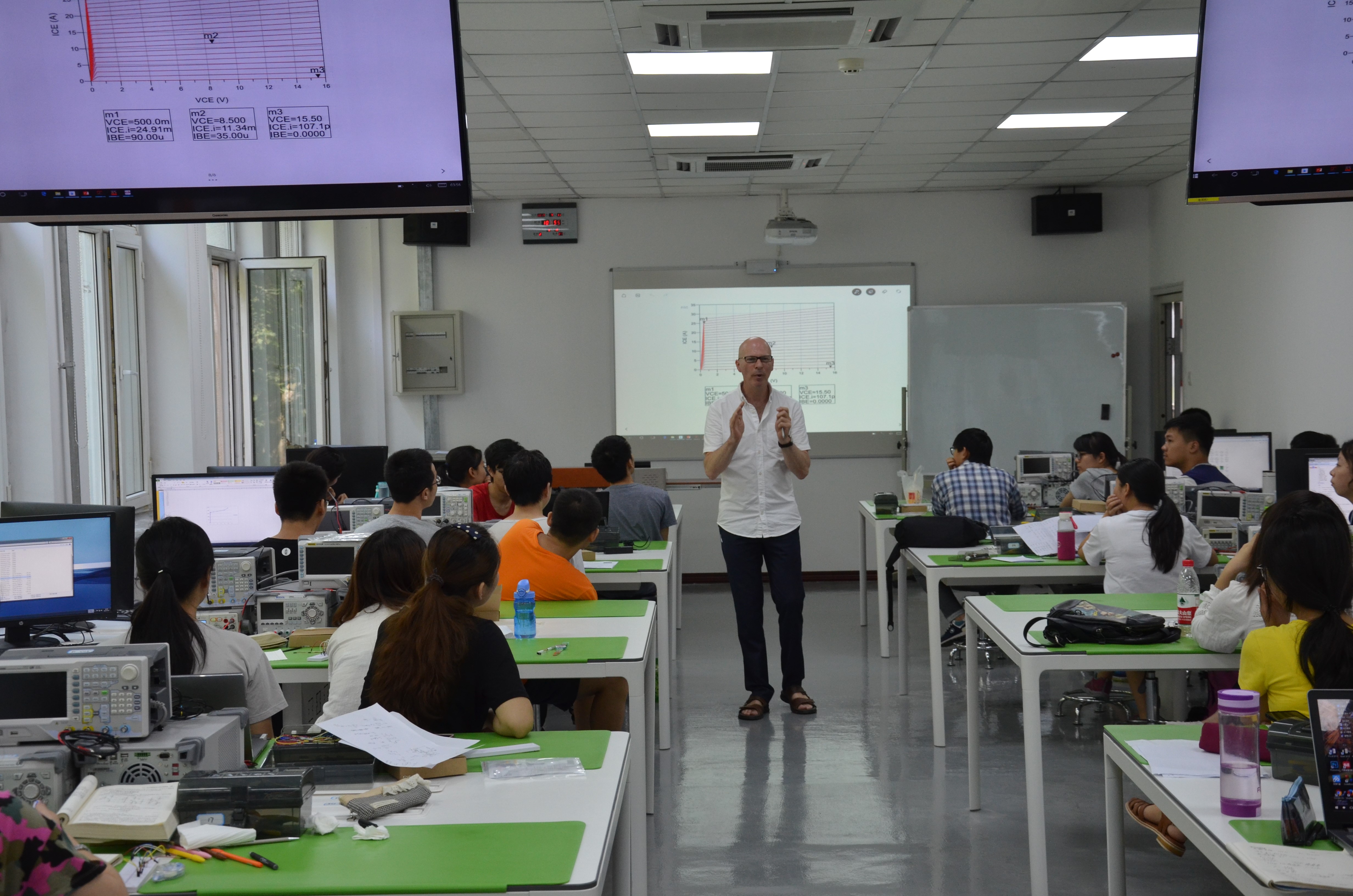 2017年7月10日至13日,来自英国卡迪夫大学的Stephen Watts副教授应邀为信息学院本科生讲授全英文暑期课程《共射极晶体管功率放大器的设计》(英文名称:The Design, Analysis and Verification of a Transistor NPN BC107 Common-emitter Power Amplifier)。学院电子专业及相关部分专业一、二年级本科生共34人积极选学了该课程。学院为本课程配备了郭俊奇老师和赵锦红老师进行辅助和协调,并安排了三名研究生助教对同学们在课程中产生的问题提供及时的帮助。Stephen生动活泼的授课方式受到了同学们的热烈欢迎,学院督导在亲临课堂后也对该门课程的开设情况给予了肯定。