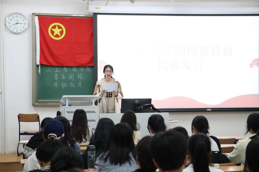 青年团校(初级班)新营员代表周飞翼同学发言。她分享了自己对于青年团校(初级班)的认识和期待,呼吁全体营员珍惜青年团校的学习机会,努力学习,积极上进,在实践中增长才干,争取早日成为一名新时期的有为青年。