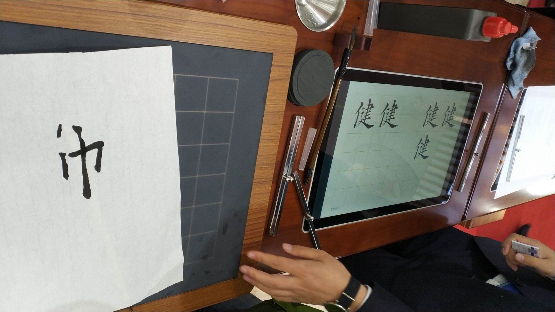 其中几个展位的成果展示令参观者印象尤为深刻:图片中展示是可应用于未来书法课的新技术——电子字帖。在显示屏上面铺上纸,我们就可以临摹书法,无需反复购买字帖,联网下载字帖。此设备技术成本不高,但创意却是难能可贵。价格视大小由几百块到一千块不等,较低的成本有利于其未来大规模的投入使用。