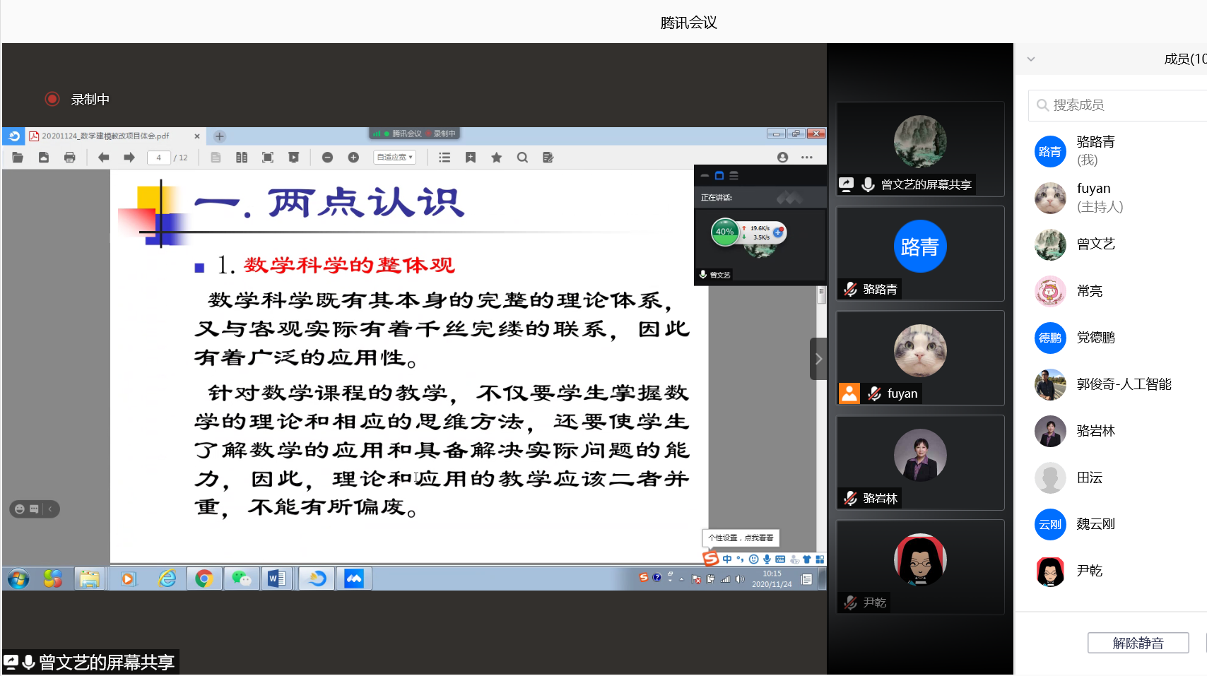 二、教改项目推进座谈会——11月24日,黑料正能量 教学建设与改革项目座谈会通过腾讯线上会议方式举行。三位2019年度教学方法改革项目的支持人分享了教改项目建设的经验。计算机科学与技术专业系主任付艳老师主持了会议,会上曾文艺老师通过“‘数学建模’课程教学模式的实践与探索”项目分享了数学课建设的难点及重点;尹乾老师通过“程序设计教材之Python语言”项目分享了学科基础课程教材建设的注意事项;常亮老师通过“‘人工智能与智慧教育’课程的实践与探索”项目分享了通识课程建设的要点。除主讲嘉宾外,本科教学副院长郭俊奇老师、2020年新立项教改项目的党德鹏老师、骆岩林老师、魏云刚老师,也参加了会议,并对项目建设与执行进行了积极探讨。