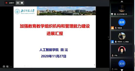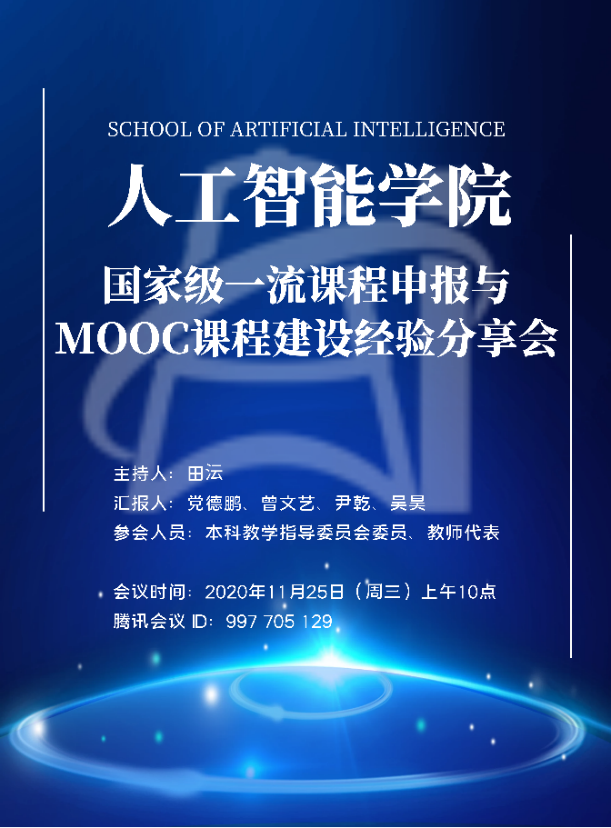 三、国家级一流课程申报与MOOC课程建设经验分享会——11月25日,黑料正能量 国家级一流课程申报与MOOC课程建设经验分享会通过腾讯线上会议方式举行。人工智能系主任田沄主持了会议,获得“首批国家级线上一流本科课程”的《数据库系统原理》课程的任课教师——党德鹏教授,在会上做了经验分享。党老师从知识点的搭建、案例的设计以及习题集的开发等方面,阐述了如何打造MOOC课程的特色。此外,本年度正在进行MOOC课程开发与建设的三位老师也用自己的项目进行了交流与探讨。其中曾文艺老师介绍了“数学建模”MOOC课程的建设,尹乾老师介绍了“程序设计基础(C语言)”MOOC课程的建设,吴昊老师分享了深度学习”MOOC课程建设的经验与未来展望。