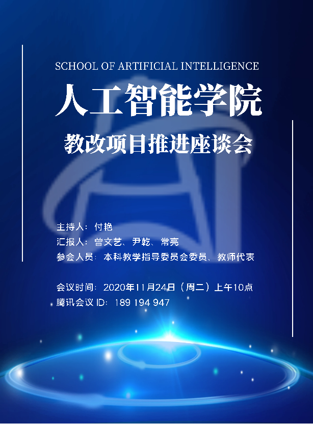 汇报人:曾文艺:“数学建模”课程的教学体会 汇报人:尹乾:“程序设计教材之Python语言 汇报人:常亮:“人工智能与智慧教育”课程的实践与探索 教师代表:党德鹏 教师代表:骆岩林 教师代表:魏云刚 教指委、全院教师自愿参加(未来有意申请教改项目的老师) |