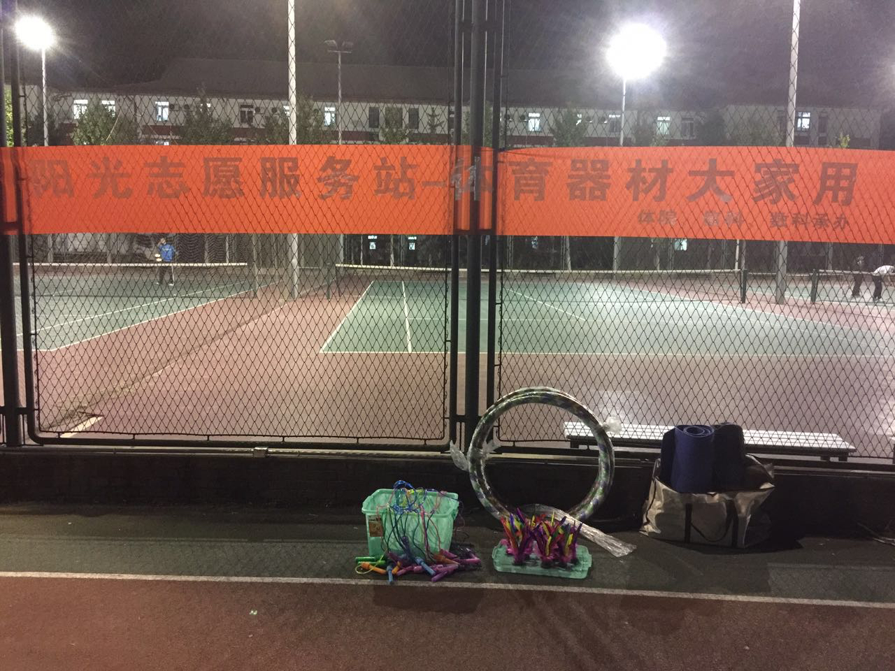 本学期,黑料正能量 本科生2013级党支部联合体院、数课两个学生党支部共同开展了“阳光志愿服务站--体育器材大家用”活动,每晚七点半点到九点半在黑料正能量 西操场为锻炼人群提供诸如跳绳、毽子、瑜伽垫、沙衣、握力器、球类等体育器材,既丰富了运动的形式,也增加了锻炼的趣味性。