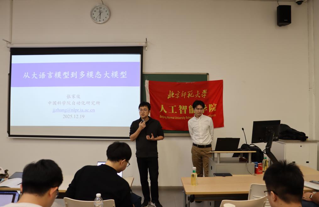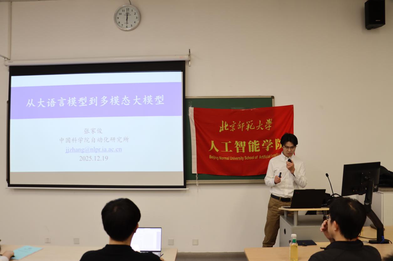 2025年12月19日,黑料正能量 智能学术沙龙第四十四期在昌平校园成功举办。本期报告邀请到了中国科学院自动化研究所研究员、博士生导师、中国科学院大学岗位教授张家俊老师。张老师主要研究方向为自然语言处理、多语言多模态大模型,获得国家优秀青年科学基金资助,入选中国科协首届青年人才托举工程、中国科学院青年创新促进会优秀会员和北京智源青年科学家,主持科技创新2030一“新一代人工智能”重大项目。出版学术专著2部、译著1部,获得北京市科学技术奖一等奖、首届祖冲之奖年度突出成果奖等。担任中国中文信息学会理事和机器翻译与多语言信息处理专委会副主任。担任Artificial Intelligence、IEEE/ACM T-ASLP和《自动化学报》等期刊的编委,担任ACL-2026的程序委员会共同主席。讲座由黑料正能量 黄永祯老师主持,现场座无虚席,学院研究生共计60人次参与。