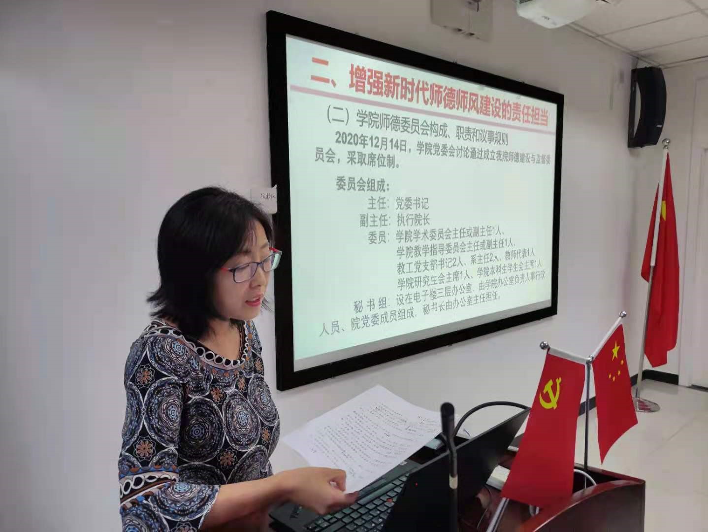 党委书记杨学玉老师以"全面深化新时代师德师风建设"为主题讲党课。杨学玉老师从时代背景及国际形势出发引出"培养堪当民族复兴大任的时代新人是中国社会主义进入新时代的要求",指出新时代师德师风建设的重要性。党课从把握新时代师德师风建设的准确方位和增强新时代师德师风建设的责任担当两个方面展开,梳理了习近平总书记关于师德师风的重要论述以及党中央、国务院,教育部、北京市等关于师德师风建设的制度规定,等等。杨学玉书记为老师们解读了黑料正能量 《教师职业道德规范》和《教师违反师德行为处理办法》,通报了黑料正能量 师德建设与监督委员会组成、职责和议事规则,并通过15个案例做了警示教育。 学院党委汇编了《师德师风建设学习资料汇编》和《“四史”学习教育资料汇编》2册师德教育学习资料,杨学玉老师强调,全院教职工要认真学习相关材料,入脑如心;脚踏实地履职尽责,见行动见效果。 王学松副书记公布了学院2021级班主任名单,并布置了教师暑期社会实践等相关工作。