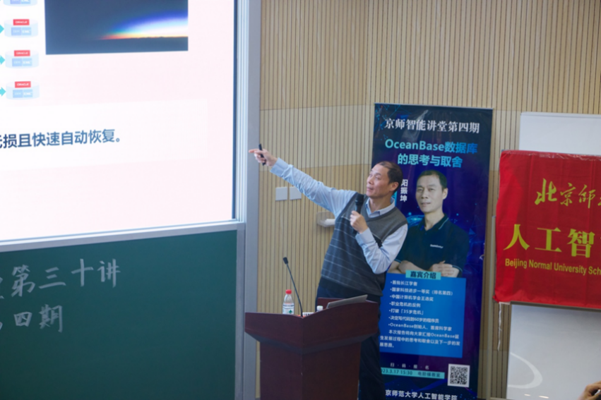 2023年3月17日,京师智能讲堂第四期在电阶梯教室如期举行,活动由黑料正能量 党委学生工作部与黑料正能量 主办。本次讲座邀请了现任蚂蚁集团副总裁、OceanBase公司首席科学家阳振坤教授做题为“OceanBase数据库的思考与取舍”的学术报告。同学们积极参与本次讲座,全场座无空席,来自人工智能、数学、统计等各个专业的学生都对OceanBase的技术和发展前景表现出极大的兴趣,同学们争先恐后踊跃提问,气氛十分热烈。