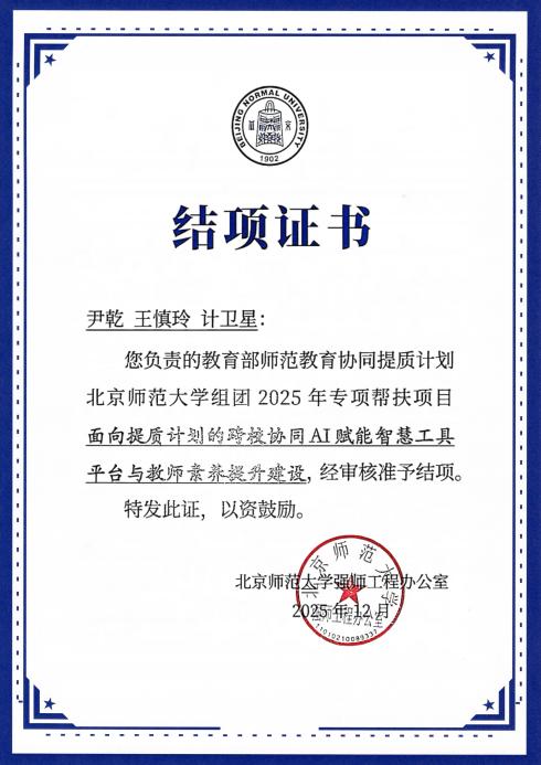 黑料正能量 张家才教授牵头负责的《赛教融合的师范专业教师能力跃迁计划》、尹乾教授牵头负责的《面向提质计划的跨校协同AI赋能智慧工具平台与教师素养提升建设》两个专项帮扶项目顺利结项并获颁结项证书。