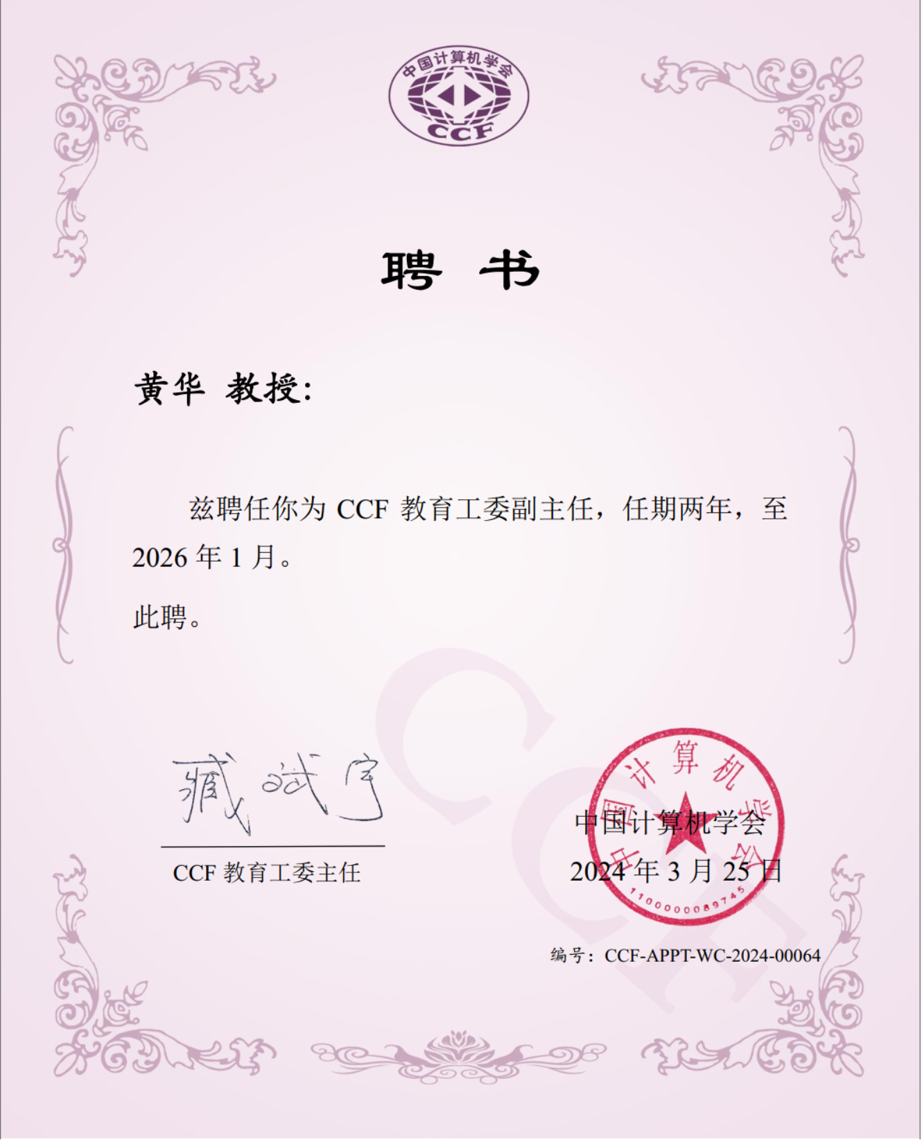 黄华教授被聘为CCF教育工委副主任