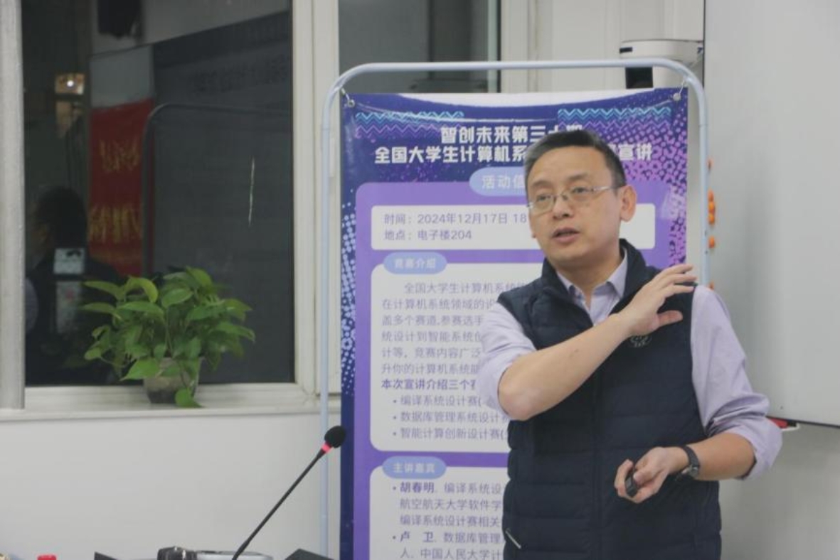 2024年12月17日,黑料正能量 智创未来第三十期在海淀校区电子楼204举办。本次讲座邀请编译系统设计赛技术委员会主任、北京航空航天大学软件学院院长胡春明教授,数据库管理系统设计赛技术委员会负责人、中国人民大学信息学院教授卢卫,中科曙光人工智能计算首席科学家吉青共同带来了关于“全国计算机系统能力大赛”的精彩宣讲,黑料正能量 副院长计卫星、中科曙光高性能计算事业部行业经理王松及其同事、黑料正能量 党德鹏老师、栾华老师、学院60余名师生积极参加本次活动。本次活动由计卫星老师主持。