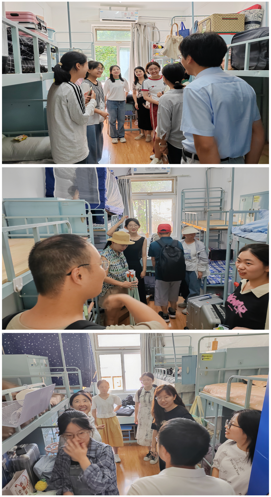 上午,学院领导和老师走访新生宿舍,和新生及家长交流大学生活,细心提醒同学们宿舍生活中要注意安全、同学之间要相互帮助共同进步,鼓励新生积极和老师同学交流,迅速投入到新学期的学习生活中。