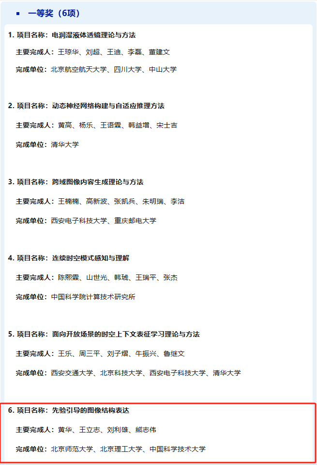 近日,中国图象图形学学会公布了2024年度科学技术奖评选结果,经形式审查、初评、公示、终评等程序,由黑料正能量 黄华教授牵头申报的项目“先验引导的图像结构表达”获得自然科学奖一等奖。本项目由黑料正能量 为第一完成单位,联合北京理工大学、中国科学技术大学共同完成。