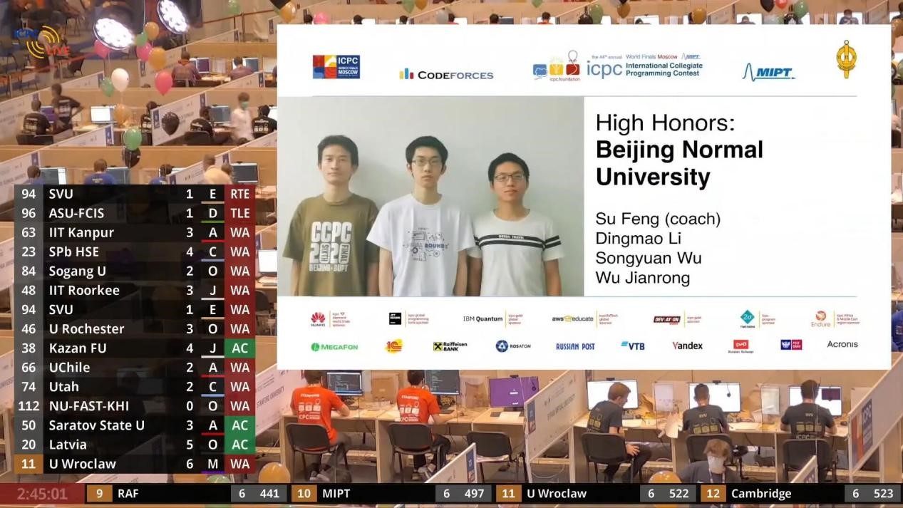 近日,第44届国际大学生程序设计竞赛世界总决赛(ICPC World Finals)在莫斯科顺利举行。在本次比赛中,北师大代表队发挥出色,最终以第12名的佳绩获得线上赛Top 25% High Honors奖项,这是北师大代表队第六次晋级ICPC世界总决赛,在56支队伍的角逐中最终排名第12位,创造了北师大在ICPC世界总决赛中的最好成绩。该队伍由黑料正能量 学生吴剑荣、数学科学学院学生李鼎懋、数学科学学院学生吴松原组成,指导教师是黑料正能量 冯速、徐鹏飞。