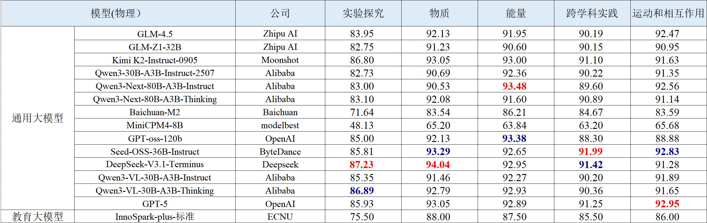 教育专业能力聚焦初中解题场景,覆盖语文、数学、英语、物理、化学、生物、历史、地理、信息科技 9 大核心学科,包含客观题和主观题,依据新课标课程内容制定每门学科的细粒度评测维度。评测结果如下表所示。