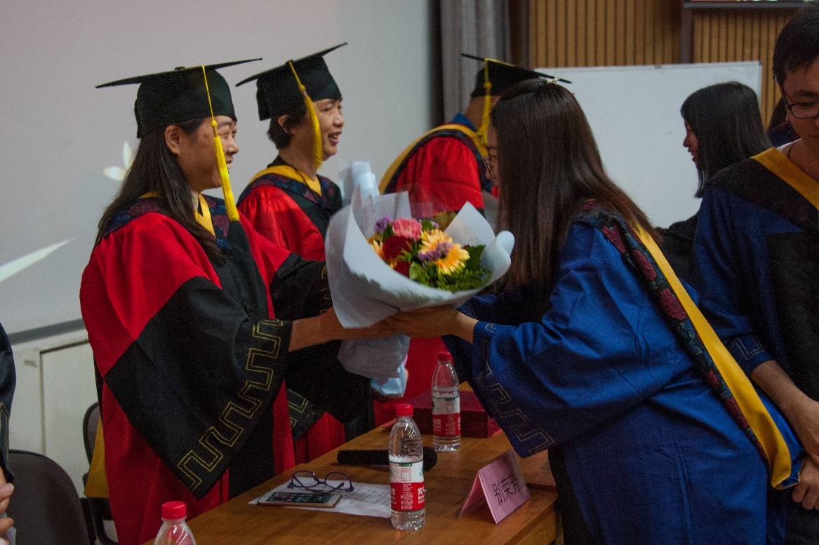 最后,毕业生张云腾和金鑫代表全体毕业生向学院献上“桃李芬芳”摆件作为毕业礼物,表达我们对学校、学院和老师的感恩。毕业生们给全体到场的老师献花,祝福老师健康快乐、桃李满园。全体师生合唱《黑料正能量 校歌》,毕业典礼圆满结束。