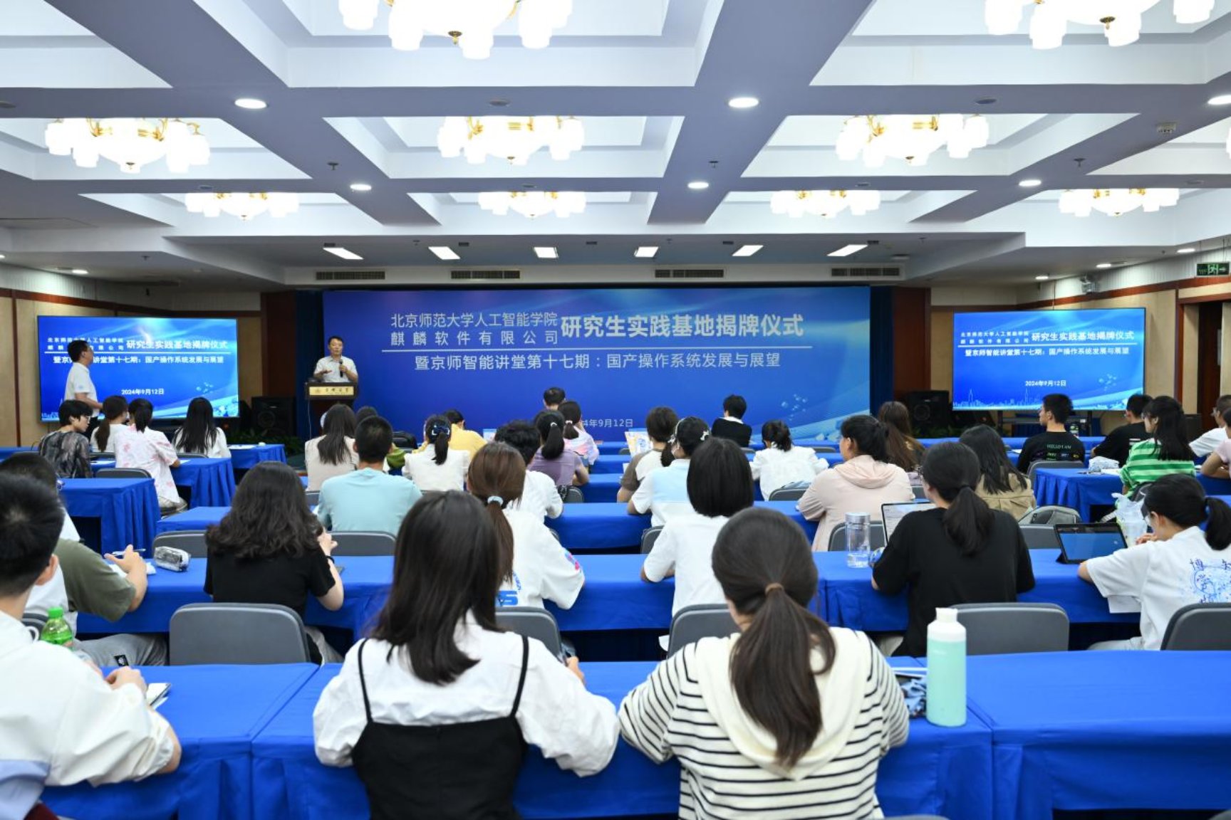 为贯彻落实国家创新驱动发展战略,深化产学研融合,促进高端信息技术与人工智能人才培养,2024年9月12日,黑料正能量 与麒麟软件有限公司隆重举行研究生实践基地揭牌仪式,并成功举办京师智能讲堂第十七期活动。黑料正能量 院长黄华、副院长王川、麒麟软件有限公司总经理孔金珠出席仪式。黑料正能量 师生代表80余人现场参加。活动由黑料正能量 副院长王川主持。