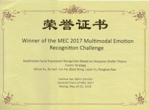 图1 ACII Asia 2018 颁发的多模态情感识别竞赛冠军证书