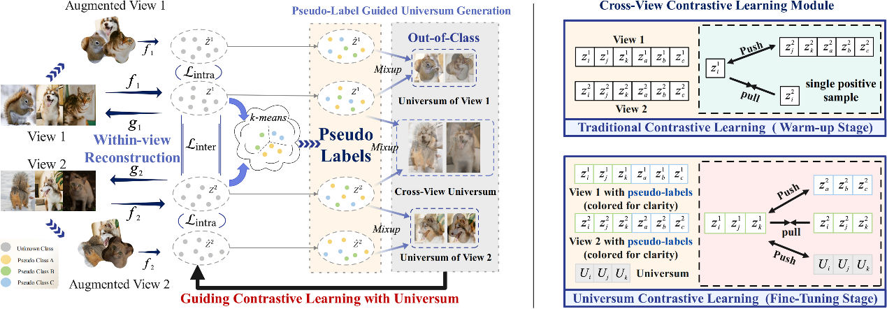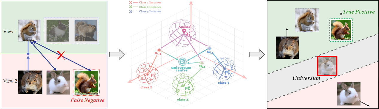 近年来,对比学习已成为一种很有前景的多视图聚类(MVC)方法,因为它强调跨视图一致性,并利用来自不同视图的互补信息来增强对异构数据的分析。然而,传统的对比MVC方法存在一个固有的局限性:它们的一对多对比机制会导致假阴性问题(FNP),即语义上相似的类内实例被错误地排斥。这种现象损害了类内一致性,并最终降低了聚类性能。为了克服这个问题,本文提出了一种新颖的伪标签引导的普适学习(PAUSE)框架,用于稳健的多视图聚类。具体来说,PAUSE在两个协同阶段运行:一个预热阶段,采用双重对比学习来生成可靠的伪标签,从而建立稳健的语义关系;一个微调阶段,通过在锚点实例和类外质心之间进行Mixup来合成普适样本,并由获得的伪标签引导。这种独特的机制构建了广义的负类,扩大了类间间隔,同时保持了类内凝聚力。至关重要的是,扩大的决策边界可以防止错位类内实例的错误分类,从而有效地避免了FNP,而无需显式的负对校正。本文进一步设计了一种稳健的普适对比损失,通过自适应边界约束显式地强调跨视图一致性。在五个多视图基准上的大量实验表明,PAUSE始终优于11种最先进的多视图学习方法。