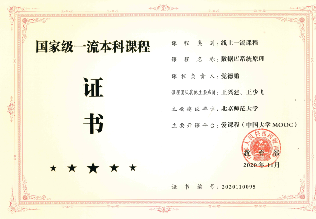 首批国家级一流本科课程《数据库系统原理》,2020.11