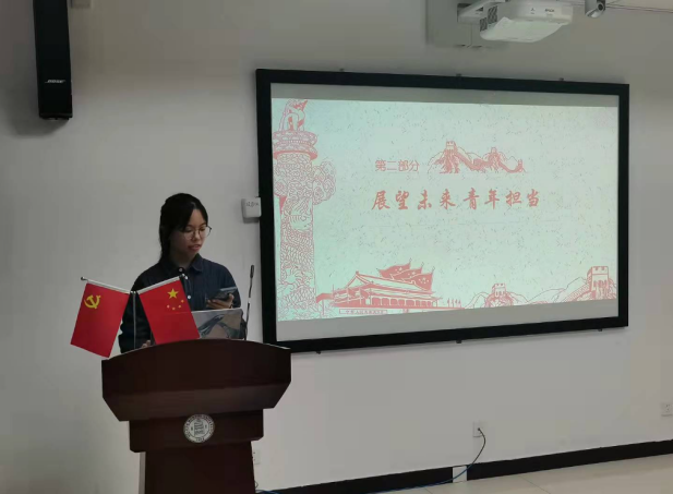 图一:组织委员刘琪同学在就“展望未来,青年担当”这一主题进行发言