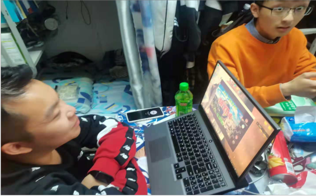 图三:由于疫情原因,同学们只能在宿舍围坐在桌前,观看会议中共享屏幕所播放的劳动节介绍短视频,但仍十分认真